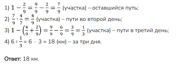 Бригада железнодорожников в первый день отремонтировала 2/9 всего участка пути, во второй день – 4/7 оставшегося участка пути, а в третий – остальные 6 км. Сколько километров пути отремонтировала бригада за три дня?