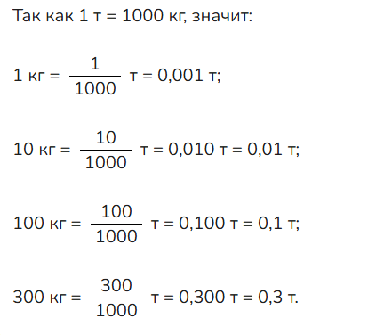 Найдите, какую часть тонны составляют 1 кг, 10 кг, 100 кг, 300 кг.