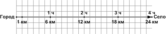 От города до села 24 км. Из города вышел человек и идёт со скоростью 6 км/ч. Изобразите на шкале расстояний (одно деление шкалы − 1 км) положение пешехода через 1 ч после выхода из города; через 2 ч; через 3 ч и т. д. Когда он придёт в село?