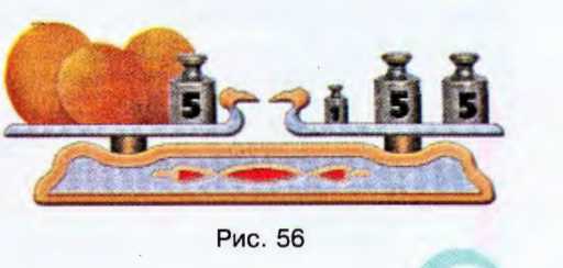 По рисунку 56 составьте уравнение и найдите массу каждой дыни. (Масса гирь дана в килограммах.)