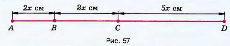 \(AB = 2x\) см; \(BC = 3x\) см; \(CD = 5x\) см; \(AD = 40\) см.