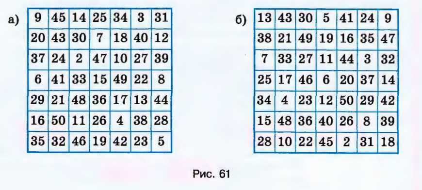 Найдите в таблице (рис. 61) все числа по порядку от 2 до 50. Это упражнение полезно выполнить несколько раз; можно соревноваться с товарищем: кто быстрее отыщет все числа?