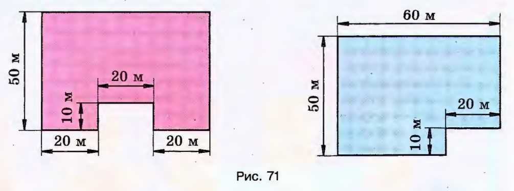 На рисунке 71 изображены два огорода. На каждый ар нужно 4 кг удобрений. Сколько удобрений потребуется на каждый участок? На оба участка?