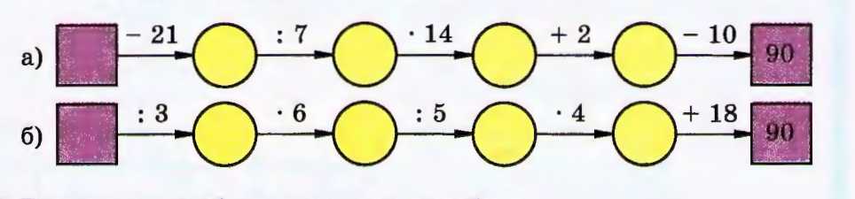 б) Аналогично, нужно восстановить исходное число, последовательно отменяя сделанные действия в обратном порядке. В данной цепочке известен исходный ориентир \(90\), и показано, как из него получали промежуточные значения: \(90-18=72\), затем \(72:4=18\), затем \(18\cdot5=90\), затем \(90:6=15\), затем \(15\cdot3=45\). Чтобы проверочно «вернуться» назад от конечного числа \(45\) к исходному \(90\), выполняем обратные операции: если последним было умножение на \(3\), то отменяем его делением на \(3\).
