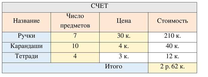 Аналогично с ручками, чтобы узнать стоимость карандашей, нужно умножить количество карандашей на цену одного карандаша. В таблице указано, что карандашей было 10 штук, а цена каждого — 4 копейки. Тогда вычисление стоимости всех карандашей будет: \(10 \cdot 4 = 40\) копеек.