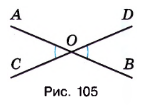 Прямые \(AB\) и \(CD\) (рис. 105) пересекаются в точке \(O\). Докажите, что углы \(AOC\) и \(BOD\) равны.
