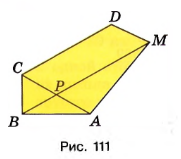 Поле разбито на четыре части: \( BPC \), \( ABP \), \( APM \), \( CDMP \). Для того чтобы найти общую площадь поля \( ABCDM \), необходимо сложить площади всех этих частей. Каждая часть представляет собой определённую фигуру с известной площадью, и сумма этих площадей даст искомое значение. Это стандартный приём в геометрии, когда сложная фигура разбивается на более простые части, площади которых легче вычислить.