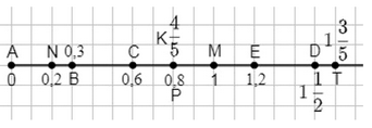 Начертите координатный луч, приняв за единичный отрезок длину 10 клеток тетради. Отметьте на этом луче точки: \(A(0), B(0,3), C(0,6), D\left(1 \frac{1}{2}\right), E(1,2), M(1), N(0,2), K\left( \frac{4}{5} \right), P(0,8), T\left(1 \frac{3}{5}\right)\).