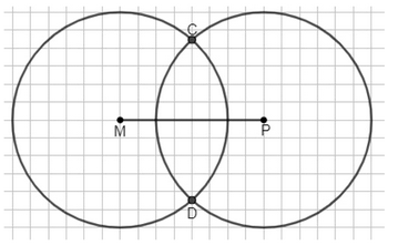 Точки \(C\) и \(D\) являются точками пересечения двух окружностей, каждая из которых построена с центрами в точках \(M\) и \(P\) соответственно. По условию, точки \(C\) и \(D\) удалены от концов отрезка \(MP\) на 3 см, то есть расстояния \(MC\) и \(PD\) равны 3 см. Это означает, что радиусы обеих окружностей равны 3 см, так как радиус окружности — это расстояние от центра до любой точки на окружности. Таким образом, радиус окружности с центром в \(M\) равен \(MC = 3\), а радиус окружности с центром в \(P\) равен \(PD = 3\).