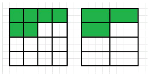 Площадь, соответствующая части, выделенной на первой сетке, равна \(\frac{6}{16}\) площади квадрата. Это можно понять, если сосчитать количество зеленых маленьких клеток — их 6 из 16 всего. Для нахождения площади этой части нужно умножить общую площадь квадрата на эту дробь: \(16 \cdot \frac{6}{16} = 6 \, \text{см}^2\). Деление и умножение здесь взаимно компенсируют друг друга, поэтому результат равен 6.