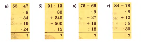 б) Начинаем с деления \(91 : 13\), чтобы определить, сколько раз число \(13\) умещается в \(91\), результат равен \(7\). Затем умножаем это число на \(80\), получая \(560\), что показывает масштабирование значения. После этого прибавляем \(240\) к \(560\), что даёт \(800\), увеличивая сумму на заданное число. Далее из \(800\) вычитаем \(500\), уменьшая результат до \(300\). В конце делим \(300\) на \(15\), получая \(20\), что показывает, сколько раз число \(15\) помещается в \(300\).