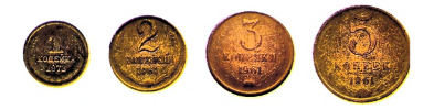 Однокопеечная монета составляет \( \frac{1}{5} \) часть массы пятикопеечной монеты.