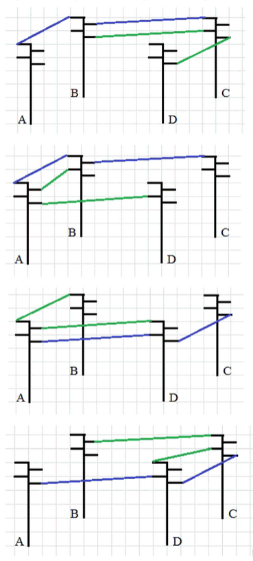 Протягивание проводов от столба А к столбу С и от столба В к столбу D требует соблюдения условия, чтобы провода не касались друг друга. Для этого необходимо продумать маршруты проводов так, чтобы они не пересекались в пространстве между столбами. На рисунках показано, что существует ровно четыре способа выполнить такую прокладку, каждый из которых отличается порядком и направлением прохождения проводов. Это связано с тем, что провода могут идти по разным уровням и обходить друг друга, создавая непересекающиеся пути.