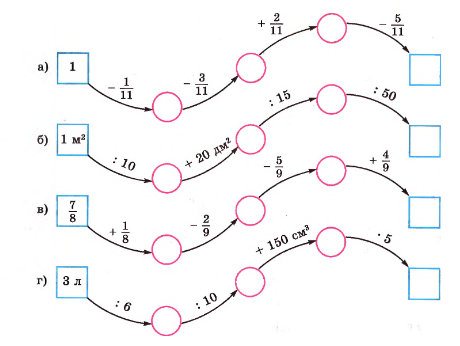 а) Рассмотрим выражение \(1 — \frac{1}{11}\). Чтобы вычесть дробь из целого числа, нужно представить целое число в виде дроби с тем же знаменателем, то есть \(1 = \frac{11}{11}\). Тогда вычитание становится \(\frac{11}{11} — \frac{1}{11} = \frac{10}{11}\). Это значит, что если у нас есть целая часть, и мы вычитаем из неё одну одиннадцатую, то остаётся десять одиннадцатых.