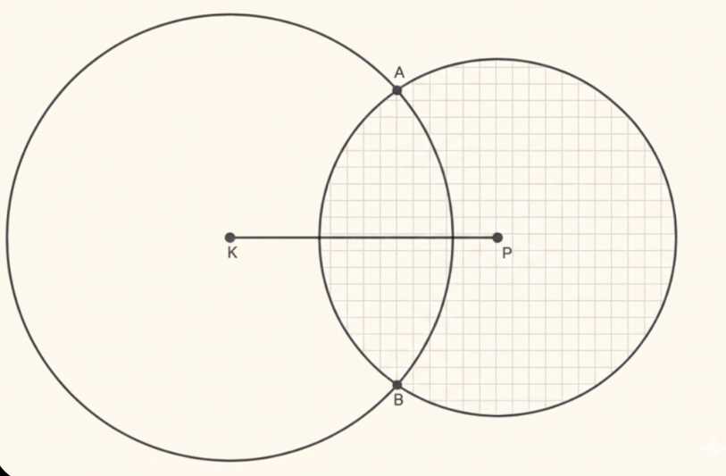 Окружности пересекаются в двух точках \( A \) и \( B \). Эти точки принадлежат одновременно обеим окружностям, то есть расстояние от \( A \) до \( K \) равно радиусу первой окружности, а расстояние от \( A \) до \( P \) равно радиусу второй. Аналогично для точки \( B \). Пересечение двух окружностей в двух точках возможно тогда, когда расстояние между центрами \( KP \) меньше суммы радиусов, но больше разности радиусов, то есть выполняется неравенство \( |r_1 — r_2| < KP < r_1 + r_2 \). Точки \( A \) и \( B \) лежат на прямой, проходящей через эти точки пересечения, которая называется хордой пересечения. Эта хорда перпендикулярна отрезку \( KP \) и делит его на две части. Таким образом, геометрически можно определить положение точек пересечения, используя свойства радиусов, расстояния между центрами и прямоугольных треугольников, образуемых радиусами и хордой \( AB \). Это ключевой момент для вычисления координат точек пересечения или анализа взаимного расположения окружностей.