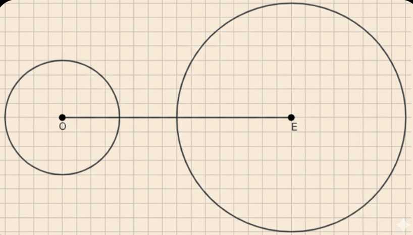 Две окружности на рисунке имеют центры в точках \( O \) и \( E \), а также радиусы, которые равны расстояниям от этих центров до точек на соответствующих окружностях. Расстояние между центрами обозначено отрезком \( OE \). На изображении видно, что отрезок \( OE \) значительно длиннее, чем радиусы обеих окружностей, то есть расстояние между центрами больше суммы радиусов. Это ключевой фактор, определяющий взаимное расположение окружностей.