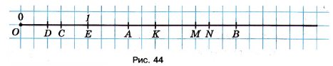 Каковы координаты точек, отмеченных на рисунке 44? Чему равно расстояние (в единичных отрезках) между точками: \(O\) и \(E\), \(O\) и \(K\), \(O\) и \(C\), \(D\) и \(C\), \(A\) и \(E\), \(M\) и \(E\)? Сравните координаты точек \(C\) и \(D\), \(C\) и \(E\), \(M\) и \(K\), \(N\) и \(A\), \(A\) и \(B\).