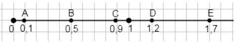 Примите за единичный отрезок длину десяти клеток тетради и отметьте на координатном луче точки \(A(0,1)\), \(B(0,5)\), \(C(0,9)\), \(D(1,2)\), \(E(1,7)\).