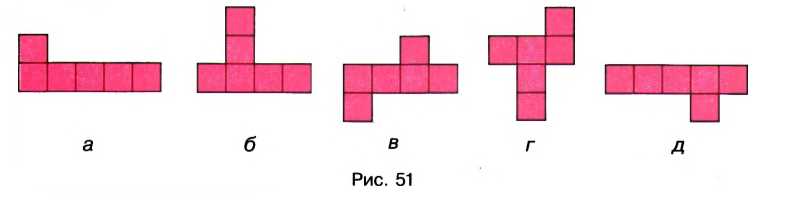 Все шесть граней куба — квадраты. Подумайте, какие из фигур, изображённых на рисунке 51, являются развёрткой поверхности куба.