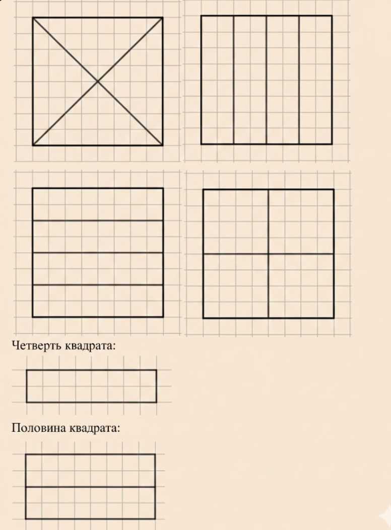 Разделите тремя способами квадрат со стороной 4 см на 4 доли. Начертите четверть квадрата, половину квадрата.