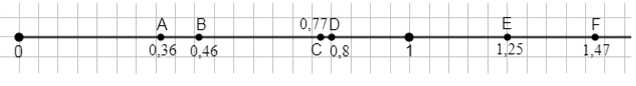 Отметьте на координатном луче точки с координатами: 0,46; 0,8; 1,25; 0,36; 0,77; 1,47. Единичный отрезок равен 1 дм.