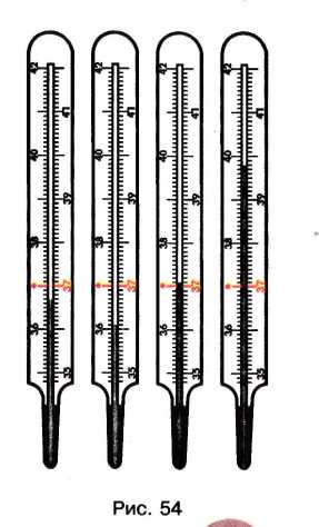 Прочитайте показания термометров (рис. 54). Сколько градусов будет показывать каждый из них, если его столбик: