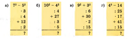 в) Сначала вычисляем сумму квадратов: \(9^2 = 81\) и \(3^2 = 9\), складываем их: \(81 + 9 = 90\). Это действие отличается от предыдущих, так как здесь используется сумма квадратов, а не разность. Следующим шагом делим 90 на 6: \(90 : 6 = 15\), что уменьшает число в шесть раз. Затем прибавляем 30 к результату: \(15 + 30 = 45\), увеличивая величину.