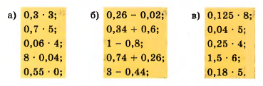 в) В умножении \(0,125 \cdot 8 = 1\) сначала умножаем \(125 \times 8 = 1000\), учитывая три знака после запятой в первом числе, получаем \(1,000\), что равно \(1\). В \(0,04 \cdot 5 = 0,2\) произведение \(4 \times 5 = 20\), с двумя знаками после запятой получается \(0,20\), что равно \(0,2\).