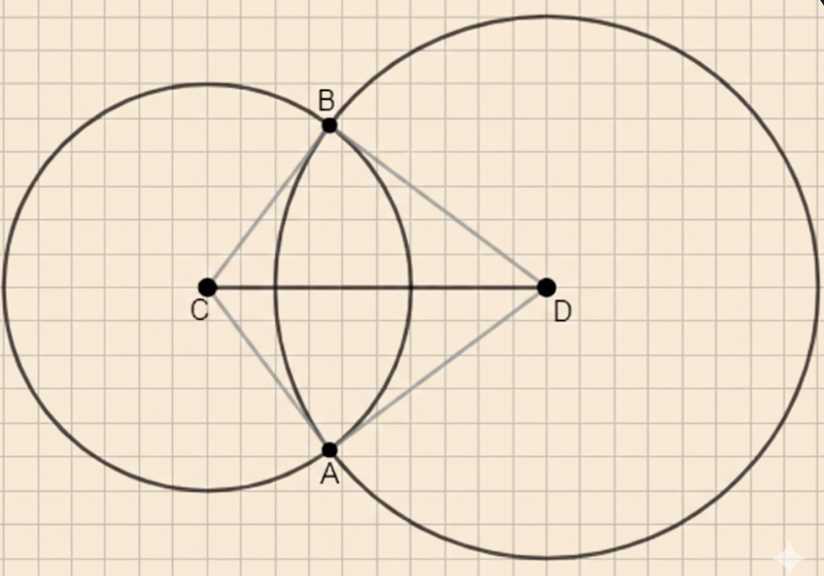 Для нахождения длины \( CD \) используем теорему Пифагора в прямоугольном треугольнике \( ACD \). Заметим, что \( AB \) — общая хорда, и поскольку \( AC = CB \), а \( DA = BD \), то эта хорда является общей для двух окружностей. Точки \( A \) и \( B \) лежат на обеих окружностях, а центры \( C \) и \( D \) находятся по разные стороны от хорды \( AB \). В треугольнике \( ACD \) известны стороны \( AC = 3 \, см \) и \( AD = 4 \, см \). Нам нужно найти \( CD \).