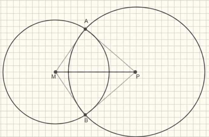 Точки \(A\) и \(B\) лежат на пересечении двух окружностей с центрами в точках \(M\) и \(P\).