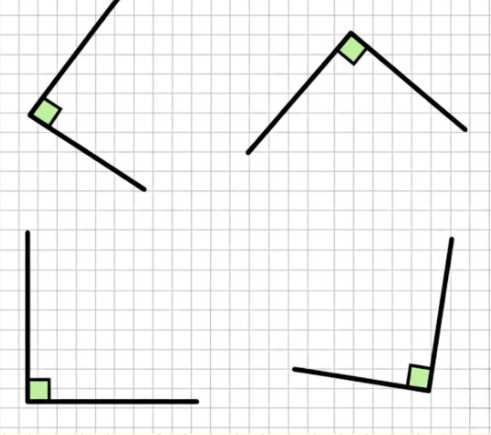 Таким образом, для получения четырёх прямых углов в разных положениях нужно просто повернуть чертёжный треугольник последовательно на углы \(0^\circ\), \(90^\circ\), \(180^\circ\) и \(270^\circ\). При каждом повороте прямой угол сохраняет свою величину \(90^\circ\), но меняет направление, позволяя изобразить прямой угол в четырёх различных ориентациях. Это простой и эффективный способ показать разнообразие положений прямого угла с помощью одного инструмента.