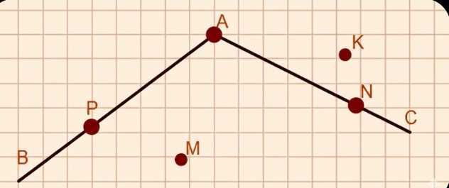 Точки \(P\) и \(N\) лежат непосредственно на сторонах угла \(BAC\), то есть на лучах \(AB\) и \(AC\) соответственно. Точка \(P\) принадлежит лучу \(AB\), так как она расположена на линии, проходящей через точки \(A\) и \(B\), и находится на том же направлении от \(A\). Аналогично, точка \(N\) лежит на луче \(AC\), так как она расположена на линии, проходящей через точки \(A\) и \(C\). Таким образом, обе эти точки принадлежат границам угла \(BAC\), и это отличает их от точек, лежащих внутри или вне угла.