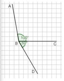 Угол \( \angle ABC \) равен \( 100^\circ \). Это заданное значение, которое показывает, насколько линия \( AB \) отклонена от линии \( BC \). Аналогично, угол \( \angle CBD \) равен \( 60^\circ \), что показывает отклонение линии \( BD \) от той же линии \( BC \), но в другую сторону. Эти углы расположены так, что их можно сложить, так как они прилегают друг к другу по общей стороне \( BC \).