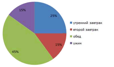 Врачи рекомендуют дневную норму питания распределить на 4 приёма: утренний завтрак — 25 %, второй завтрак — 15 %, обед — 45 % и ужин — 15 %. Постройте круговую диаграмму распределения дневной нормы питания.