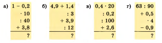 в) Здесь сначала умножаем 0,4 на 20, что означает увеличение числа 0,4 в 20 раз: \(0,4 \cdot 20 = 8\). Это полезно для масштабирования или подсчёта общего количества при известной доле. Затем делим полученное число 8 на 0,2, чтобы выяснить, сколько раз 0,2 помещается в 8: \(8 : 0,2 = 40\). Деление на десятичную дробь увеличивает значение, так как мы делим на число меньше единицы. После этого делим 40 на 100, что уменьшает число в 100 раз: \(40 : 100 = 0,4\). Наконец, складываем 0,4 с 2,6, чтобы получить итоговое значение: \(0,4 + 2,6 = 3\).