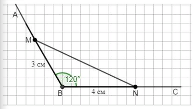 Начертите угол \( ABC \), равный \( 120^\circ \). На стороне \( BA \) отложите отрезок \( BM \), равный 3 см, а на стороне \( BC \) — отрезок \( BN \), равный 4 см. Соедините отрезком точки \( M \) и \( N \). Измерьте стороны и углы получившегося треугольника и найдите периметр и сумму градусных мер углов этого треугольника.