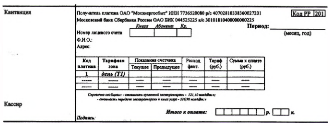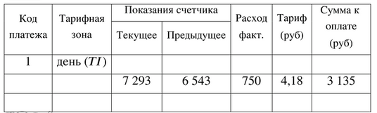 Заполните бланк для оплаты электроэнергии за апрель 2015 г., если показание счётчика на конец марта 2015 г. составляло 6543 КВт·ч, на конец апреля — 7293 КВт·ч, а стоимость 1 КВт·ч была равна 4,18 р.