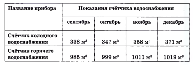 1) Расход холодного водоснабжения в каждом месяце последнего квартала года определяется как разница между показаниями счетчика на конец и начало месяца. Для октября это вычисляется как \(347 — 338 = 9\) кубических метров, что означает, что за октябрь было израсходовано 9 м³ холодной воды. Аналогично, для ноября расход равен \(358 — 347 = 11\) м³, а для декабря — \(371 — 358 = 13\) м³. Такой подход позволяет точно определить объем потребленной воды за каждый месяц, учитывая показания счетчиков.