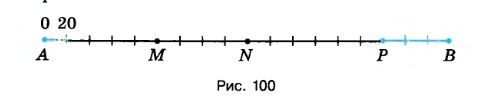 На рисунке 100 изображена шкала расстояний от города А до города В. Каждое деление шкалы соответствует расстоянию 20 км. Точками \(M, N, P\) отмечены расстояния, которые прошла автомашина через каждый час, двигаясь из города \(A\) в город \(B\). Определите: