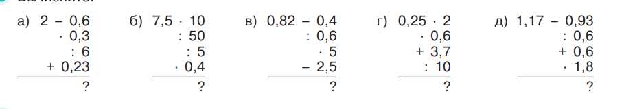 д) \(1,17 — 0,93 : 0,6 + 0,6 — 1,8\).