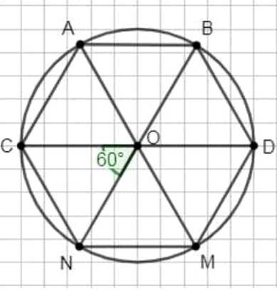 2) Соединяем последовательно точки \(C,A,B,D,M,N\) хордами. Любые две соседние точки ограничивают дугу в \(60^\circ\), значит соответствующая хорда стягивает центральный угол \(60^\circ\). В каждом секторе получаем треугольник с вершиной в центре: например, \(\triangle COA\), \(\triangle AOB\) и т.д. В каждом таком треугольнике две стороны являются радиусами окружности, то есть равны \(R\), а угол между ними равен \(60^\circ\). Следовательно, каждый из этих треугольников равносторонний: если в треугольнике две стороны \(R\) и угол между ними \(60^\circ\), то третья сторона также равна \(R\), поскольку по свойству треугольника с углом \(60^\circ\) при равных прилежащих сторонах он становится равносторонним.
