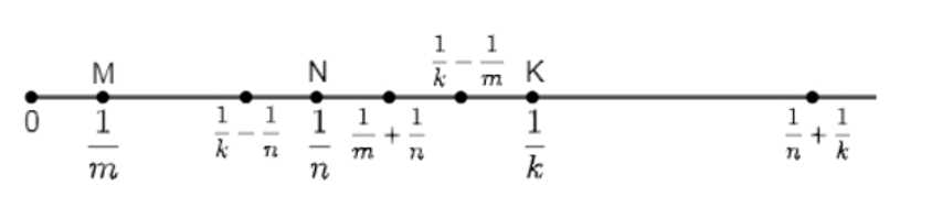 г) Чтобы отметить точку \(\frac{1}{n} + \frac{1}{k}\), надо от точки \(N\left(\frac{1}{n}\right)\) отсчитать вправо отрезок \(\frac{1}{k}\).