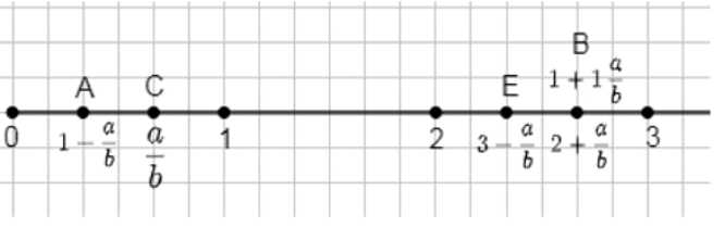 3) Точка \(E\) имеет координату \(3 — \frac{a}{b}\). Это означает, что мы начинаем от точки 3 и сдвигаемся влево на величину \(\frac{a}{b}\). Поскольку \(\frac{a}{b}\) положительна, вычитание уменьшает значение, поэтому точка \(E\) находится между 2 и 3, ближе к 3, но левее него. На рисунке видно, что \(E\) расположена именно в этой позиции, что совпадает с заданной координатой. Таким образом, все точки отмечены на числовой оси согласно их координатам, учитывая направление и величину сдвига от целых чисел.