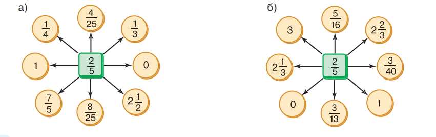 1. Рассмотрим сначала часть а). У нас есть число в квадратике \( \frac{2}{5} \), и нам нужно понять, как из него получить числа, записанные в кружках. Для этого используются операции умножения или сложения с определёнными дробями или числами. Например, чтобы получить число \( \frac{4}{25} \), мы умножаем \( \frac{2}{5} \) на само себя: \( \frac{2}{5} \cdot \frac{2}{5} = \frac{4}{25} \). Это объясняет, почему в кружке стоит именно эта дробь. Аналогично, чтобы получить \( \frac{1}{3} \), мы умножаем \( \frac{2}{5} \) на \( \frac{5}{6} \), так как \( \frac{2}{5} \cdot \frac{5}{6} = \frac{2 \cdot 5}{5 \cdot 6} = \frac{1}{3} \).