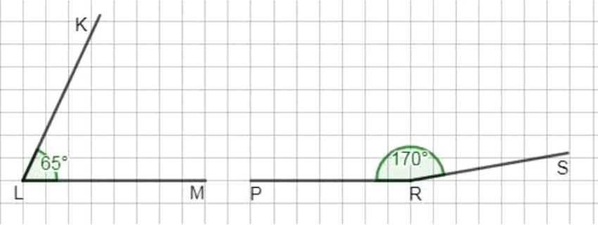 Используя транспортир, постройте \(\angle KLM=65^\circ\) и \(\angle PRS=170^\circ\).
