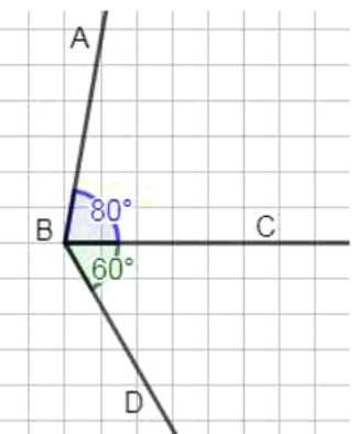 Проведите луч \(BC\) и постройте \(\angle ABC=80^\circ\) и \(\angle DBC=60^\circ\). Найдите угол \(ABD\). Проверьте ответ с помощью транспортира. Сколько решений имеет задача?