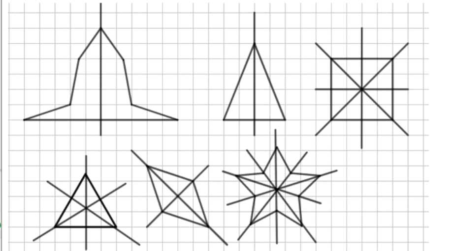 а) Колокольчик и равнобедренный треугольник имеют по одной оси симметрии, потому что у каждой из этих фигур существует одна линия, относительно которой фигура совпадает сама с собой при отражении. Для колокольчика эта ось проходит вертикально через центр, деля фигуру на две зеркально равные части. Аналогично, равнобедренный треугольник симметричен относительно высоты, опущенной на основание, которая является единственной осью симметрии.