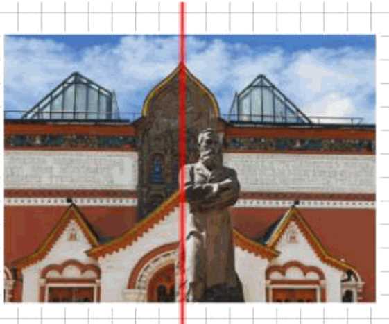 Фасад здания Государственной Третьяковской галереи в Москве является примером архитектурной симметрии, которая выражается в равенстве и зеркальном отражении элементов с обеих сторон центральной оси. Центральная ось симметрии проведена вертикально через центр композиции, проходя через статую и архитектурный элемент с куполом. Эта ось делит фасад на две равные части, каждая из которых является зеркальным отображением другой. Симметрия в архитектуре — это не только эстетический прием, но и способ придать зданию гармоничность и устойчивость визуального восприятия.