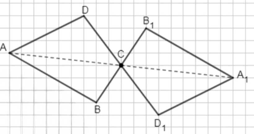 Это означает, что при симметрии относительно точки \(C\) каждая точка \(X\) исходного четырехугольника переходит в точку \(X_1\), расположенную так, что \(C\) — середина отрезка \(XX_1\). Геометрически это значит, что вектор от \(C\) к \(X_1\) равен по длине и противоположен по направлению вектору от \(C\) к \(X\), то есть \( \overrightarrow{CX_1} = — \overrightarrow{CX} \).