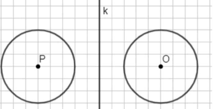 а) Начертите окружность с центром P и прямую k, не пересекающую эту окружность. Постройте окружность с центром O, симметричную этой окружности относительно оси k.